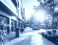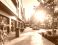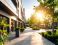 Panel Szklany do Łazienki - Sunlit modern street with shops and lush landscaping #1653615031