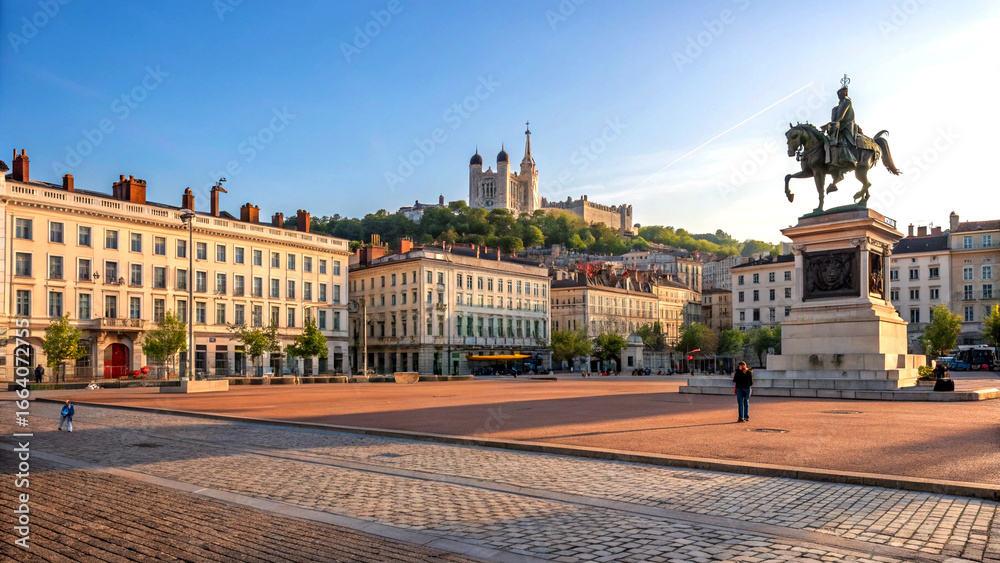 • Sunny plaza view of place bellecour in lyon with grand architecture
