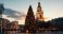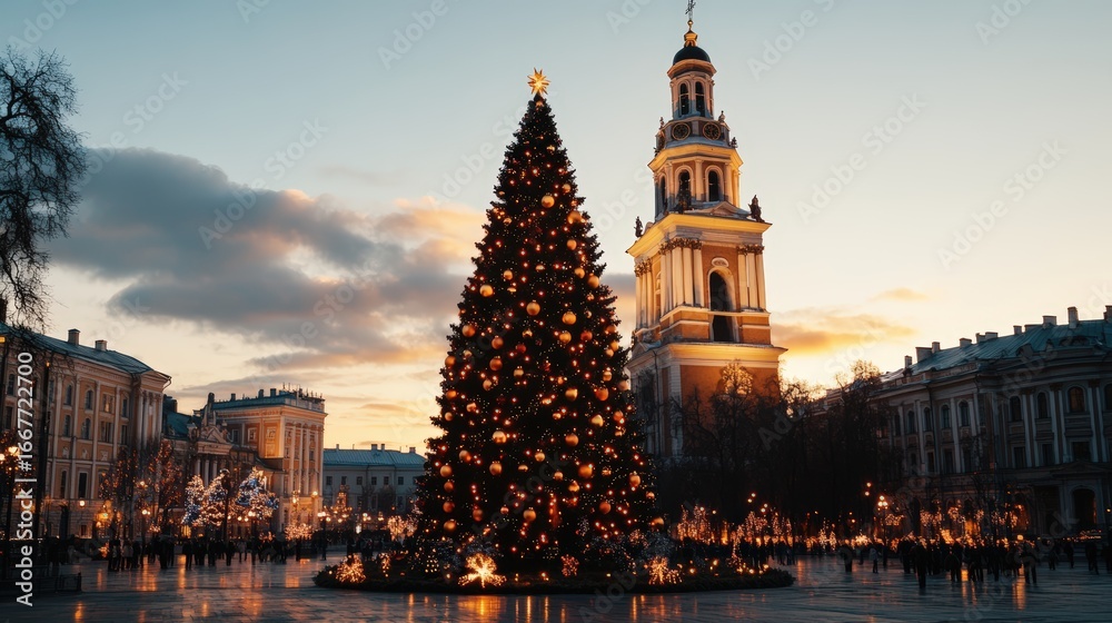 • Large Christmas tree decorated with lights and ornaments near historic clock tower du sunset in winter city square