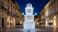 • A large, illuminated snowman, crafted from plastic bottles, stands in a bustling city street at night, showcasing festive holiday decorations and pedestrian activity.