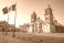 • historic cathedral in mexico city town square with flag and blue sky