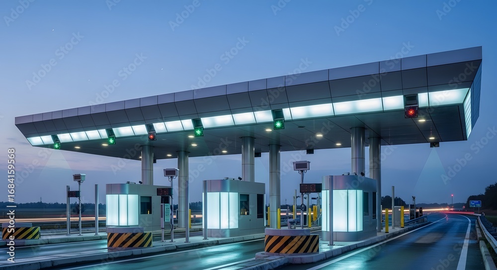 • Modern illuminated highway toll plaza at dusk with wet road reflections. Efficient transportation infrastructure and traffic management system.