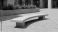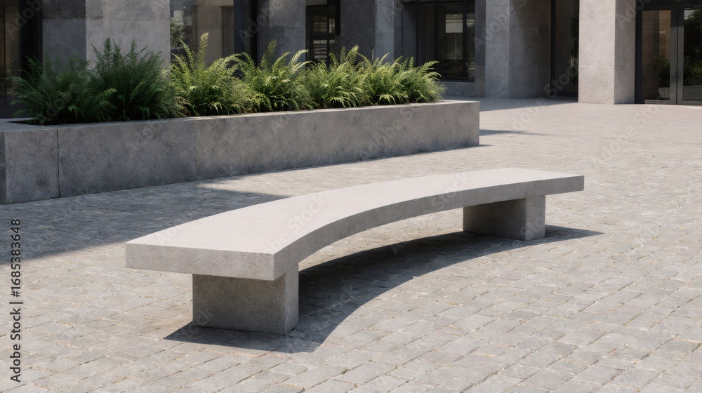 • Modern curved concrete bench in a contemporary urban plaza with green plants