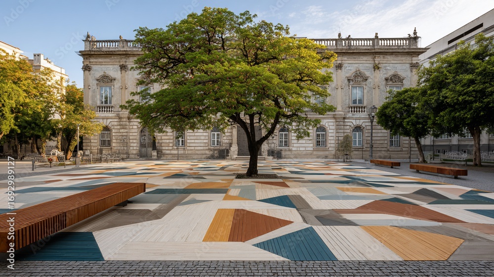 Panel Szklany do Łazienki - Public square with patterned ground and large tree before an ornate building #1692989127