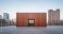 • A modern, minimalist wooden building stands in an open urban plaza, surrounded by high-rise city architecture under a clear sky.
