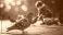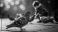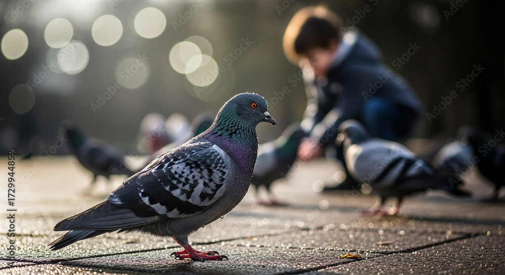 Panel Szklany do Łazienki - Pigeon stands on city square while child feeds birds in background #1729944859