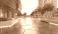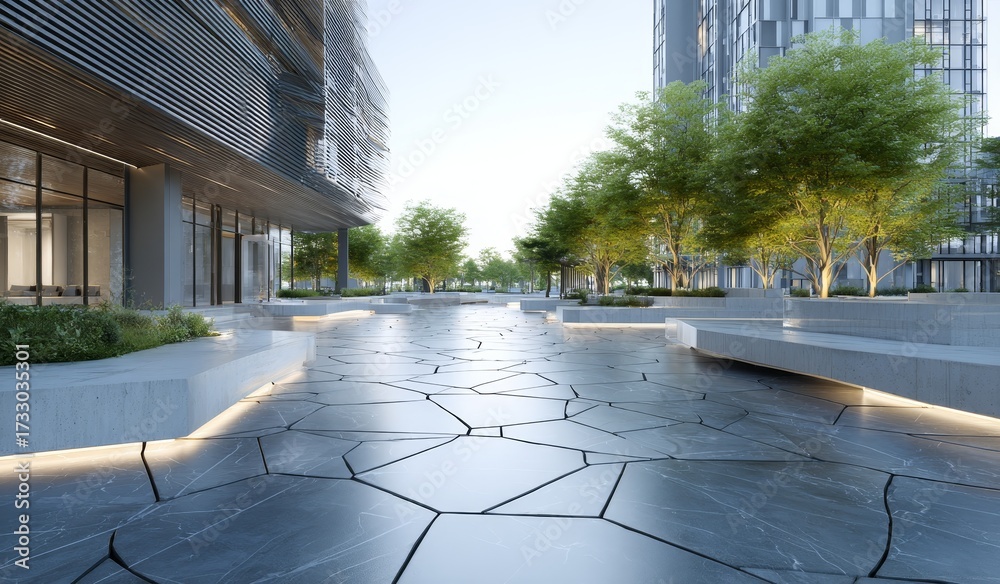 • A modern urban square featuring contemporary buildings, green trees, and a geometric patterned pavement with ambient lighting.