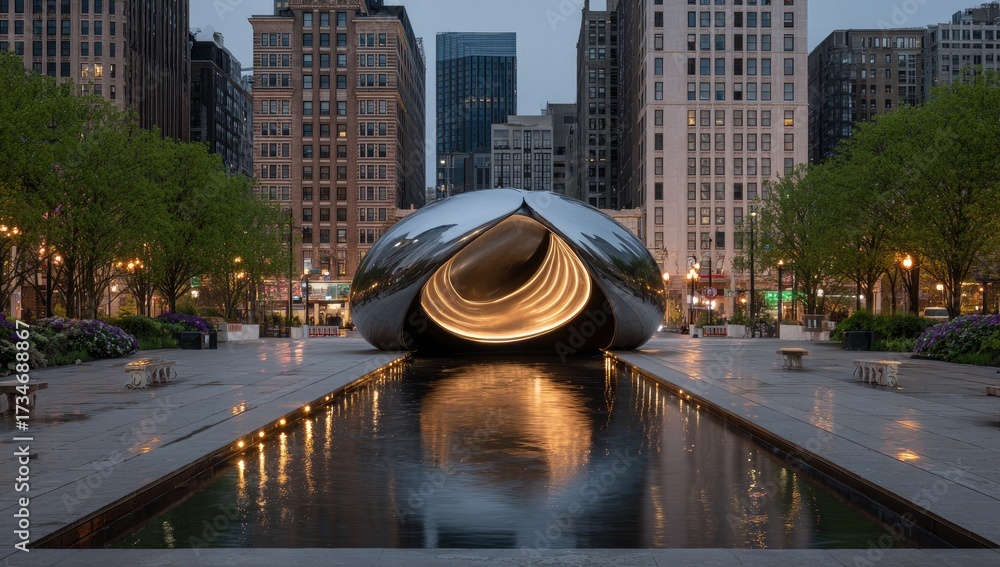 Panel Szklany do Łazienki - Reflective bean sculpture in city park at twilight #1734688867