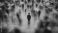• A single person with a backpack stands still in the center of a plaza while many other people move rapidly around them, creating a sense of motion blur.