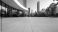 • Modern city square with futuristic buildings, wide pedestrian area, and lush greenery