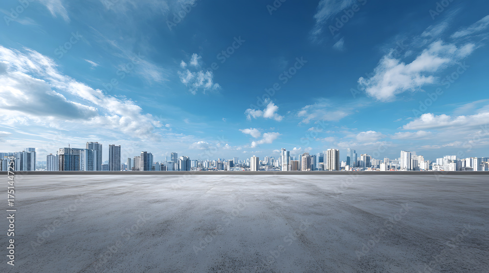 • Expansive Concrete Plaza with Modern City Skyline Under Blue Sky