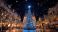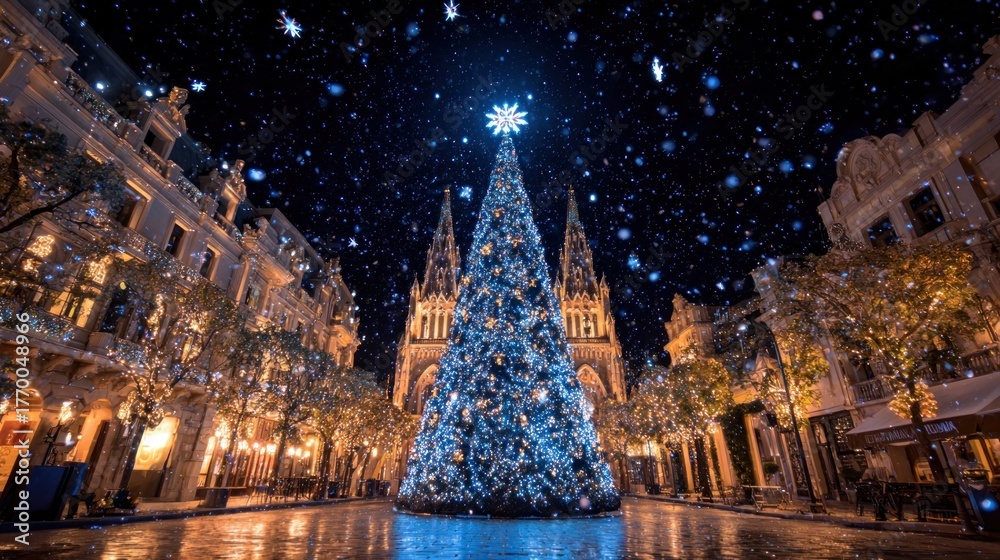 • A grand Christmas tree in a city square, sparkling with thousands of lights and topped with a star