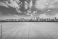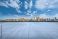 • Empty square floor tile plaza providing a panoramic view of the modern city skyline on a clear sunny day.