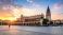 • Krakow's Main Market Square showcases historical architecture under a vibrant sunset, soft blur