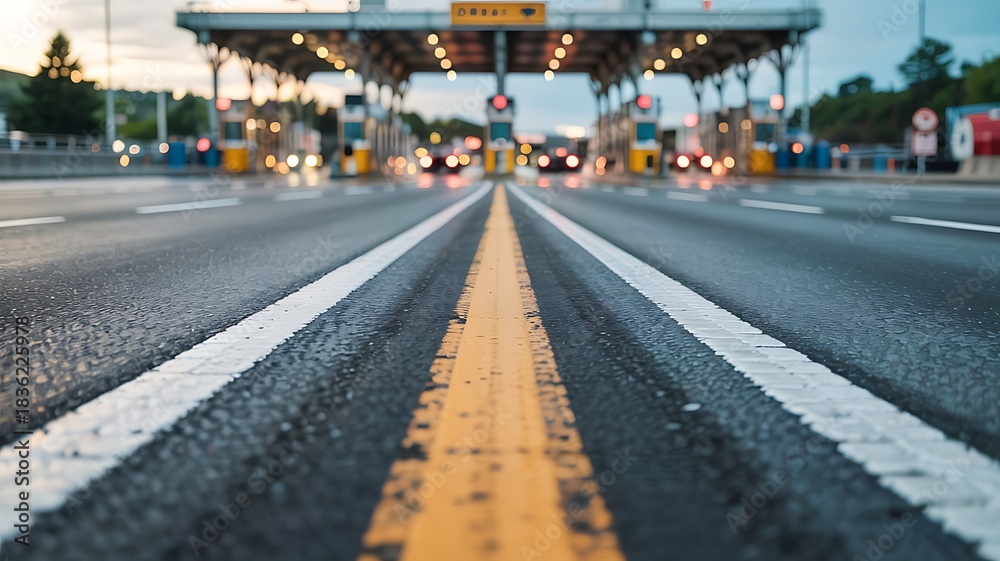 • Approaching a brightly lit toll plaza on a multi lane highway at dusk with cars in motion and blurred lights