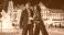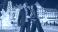 • Happy interracial couple enjoying a winter night in a festive city square. Romantic man and woman standing near Christmas lights and ice sculpture