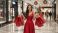 • Happy woman holding red shopping bags in a decorated mall. Christmas holiday sale and retail concept. Young lady in elegant dress with gifts