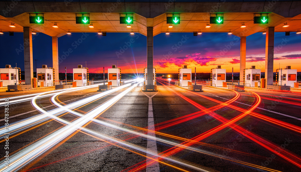 • Mesmerizing blue-hour long-exposure highway toll plaza with light trails