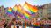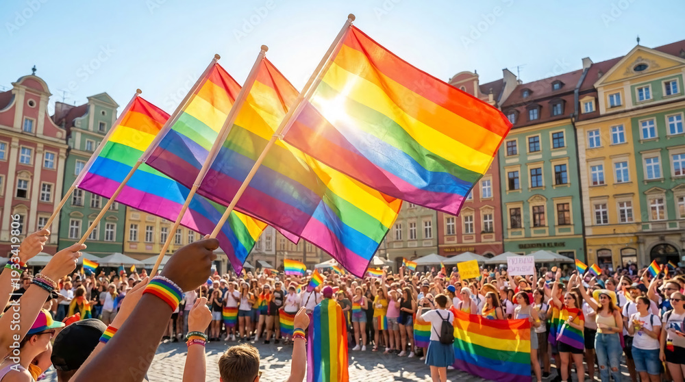• Crowd holding rainbow flag at outdoor event with colorful building, symbolizing pride, diversity, equality, and support for LGBTQ+ community in a city square