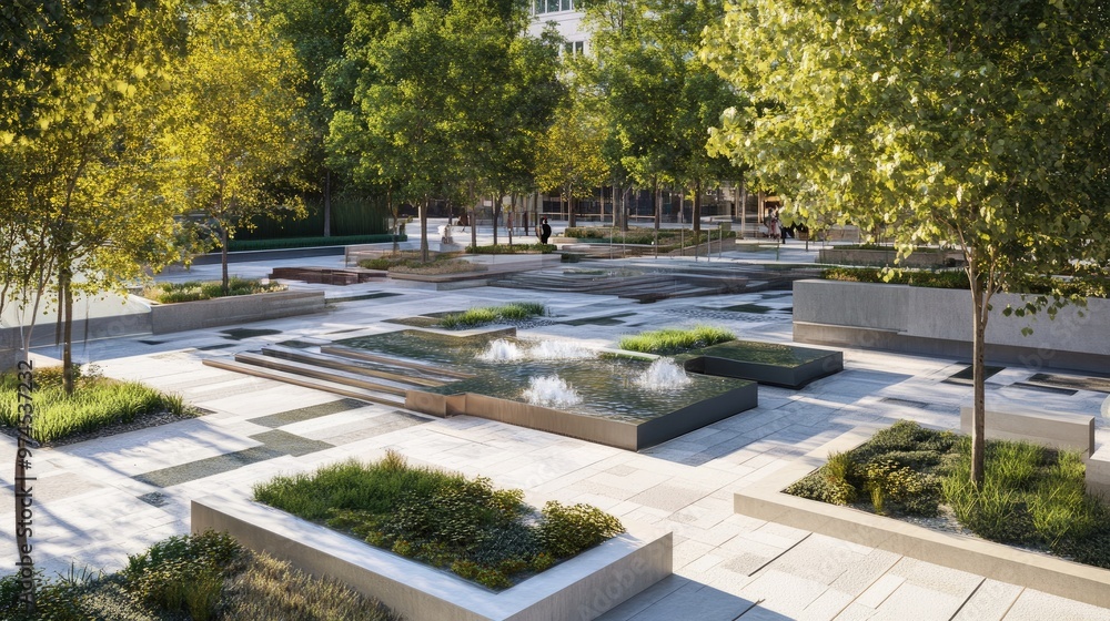 • Contemporary public square with geometric design elements, water features, and integrated seating areas -