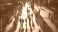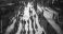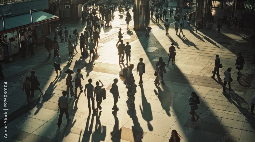 • Silhouettes of people walking and mingling in an urban plaza with long shadows cast by the morning sun, creating a bustling yet serene city scene.