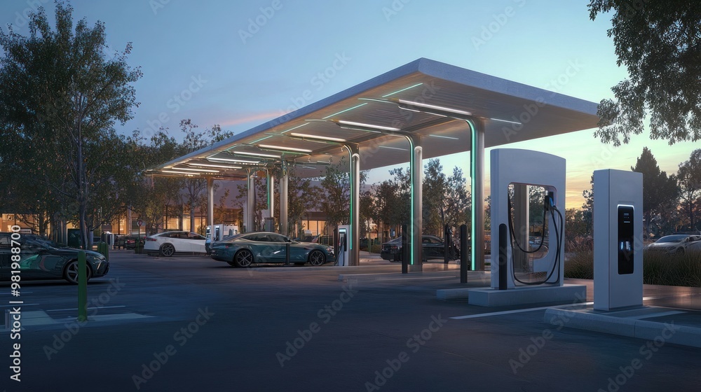 Panel Szklany do Łazienki - A large electric vehicle charging plaza with ultra-fast chargers, digital interfaces, and a... #981988700