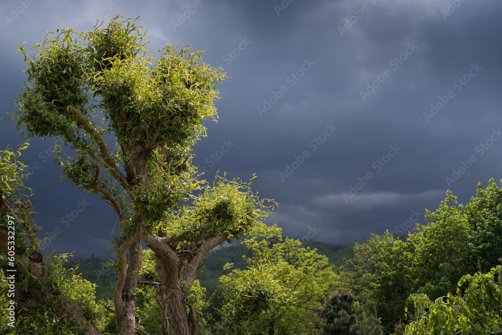 Naklejki Niebo - Burzowe niebo ponad zielonym ogrodem #605332297