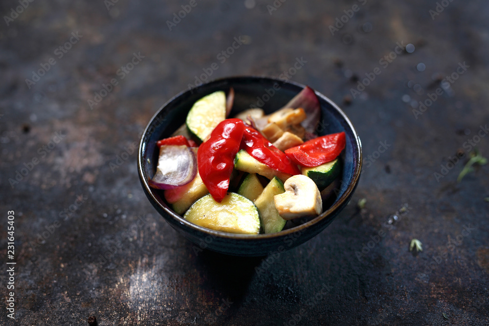 Panel Szklany Warzywa - Grillowane warzywa Papryka, pieczarki cukinia w miseczce na ciemnym tle. #231645403