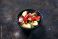 Grillowane warzywa Papryka, pieczarki cukinia w miseczce na ciemnym tle.