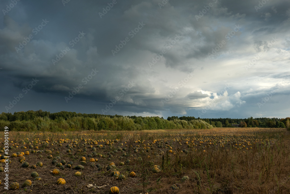 Panel Szklany Warzywa - Uprawa dyń, krajobraz, piękne chmury #533001519