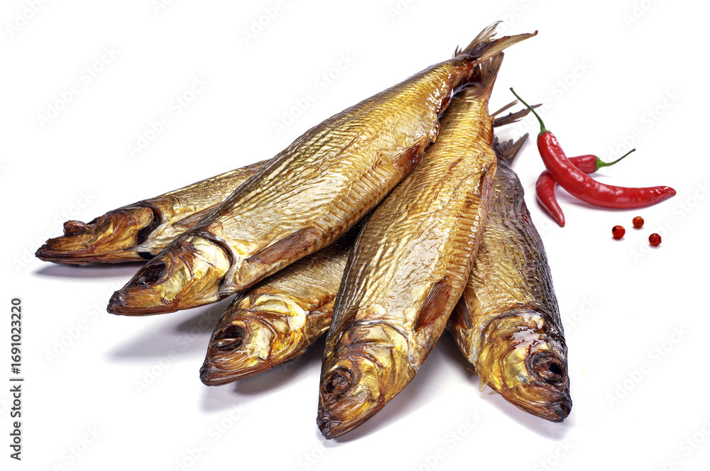 • Sześć wędzonych piklingów z papryczką na białym tle