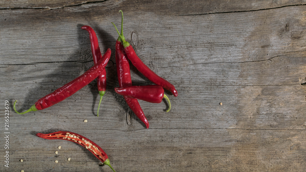 Panel Szklany Papryczka - Papryka czerwona chili na drewnianym stole #216523679