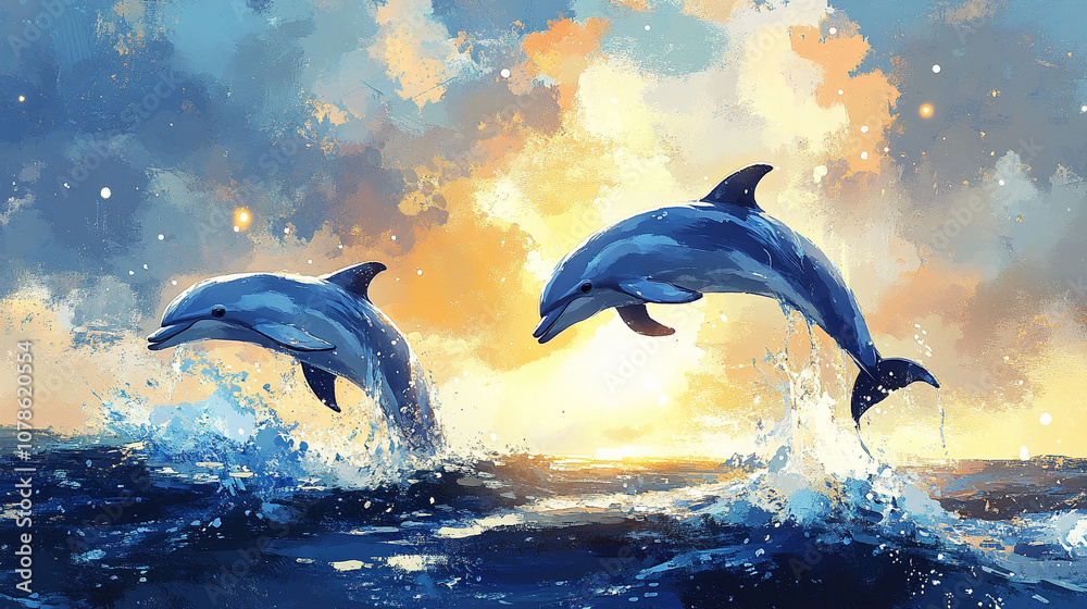 Fototapeta Trendy - Delfiny skaczące nad wodą, tapeta generative ai #1078620554