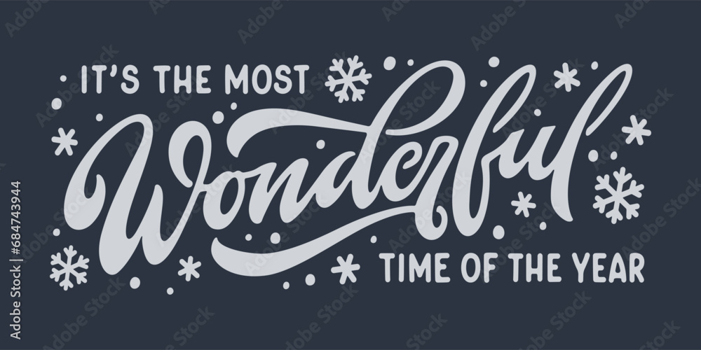 • It is the most wonderful time of the year lettering template. Christmas greeting card invitation with snowflakes. Winter holidays related typographic quote. Vector vintage illustration.