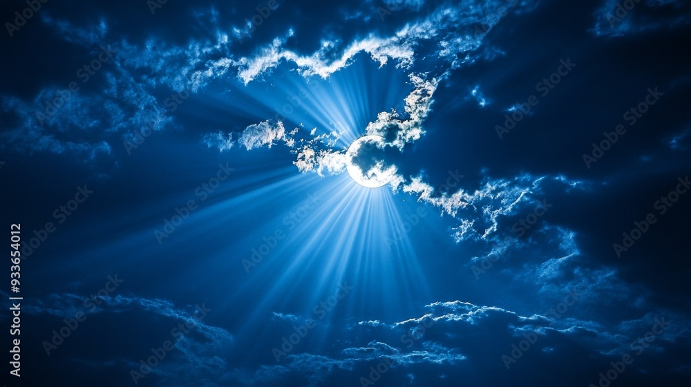 • A moonlit night. Thin clouds obscure most of the moon, but rays of light shine through.