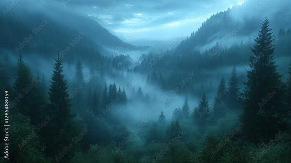Las - Misty forest valley at dawn with blue atmospheric lighting. #1265488059