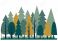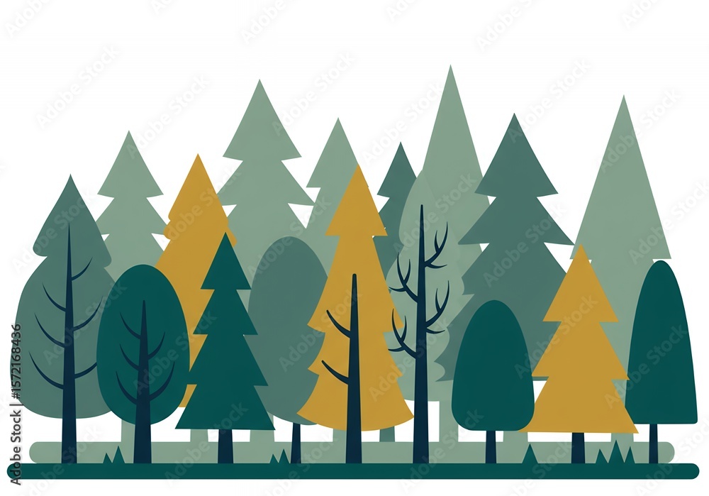 • Stylized forest illustration with evergreen and deciduous trees, flat design