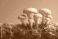 Las - Group of agaricus mushrooms growing on mossy wood against a teal background #1592674676