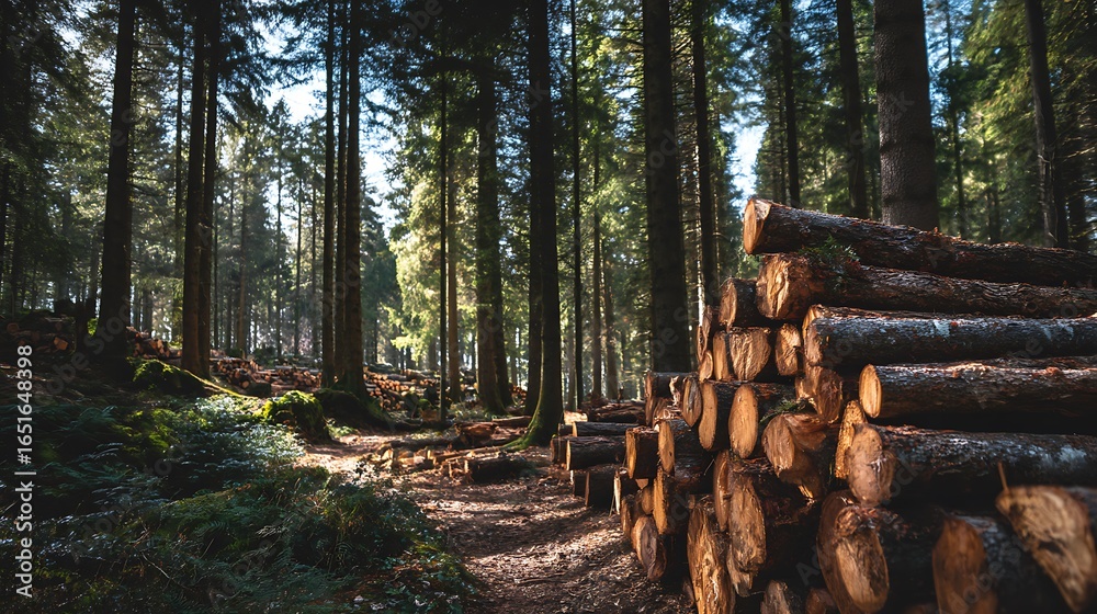 Las - Pile of freshly cut logs in a sun-drenched forest clearing, representing logging industry,... #1651648398