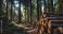 • Pile of freshly cut logs in a sun-drenched forest clearing, representing logging industry, deforestation, forestry management, nature, timber and wood resources