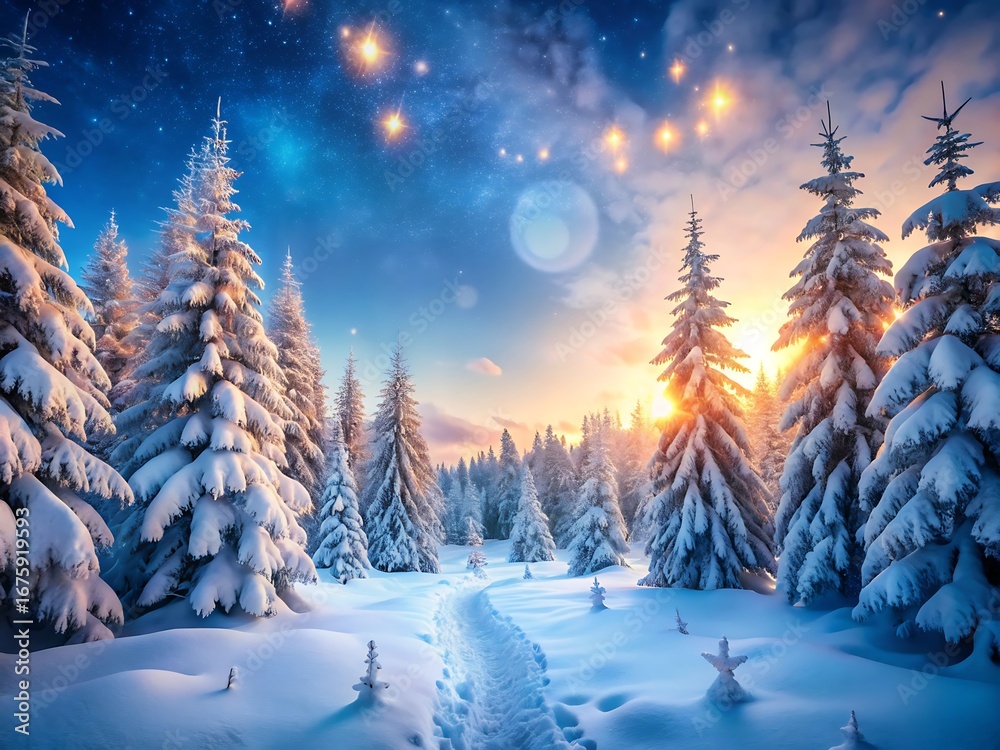 • Magical winter landscape with snowcovered trees and a path leading into the serene, sunlit forest
