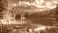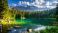 • Azure lake reflects mountain range and surrounding evergreen forest scenery