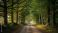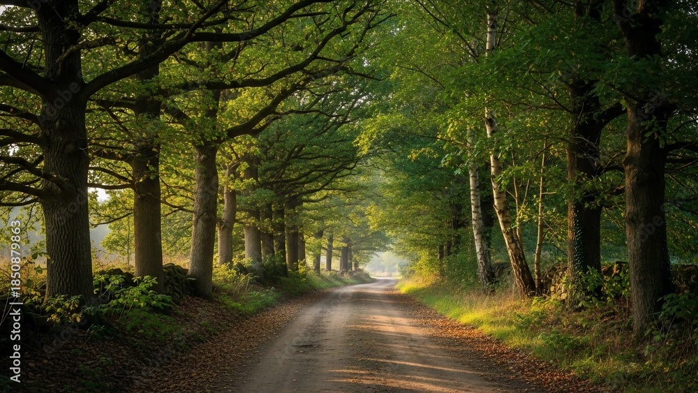 • Sunlit forest path winding through a majestic tree tunnel in the morning.