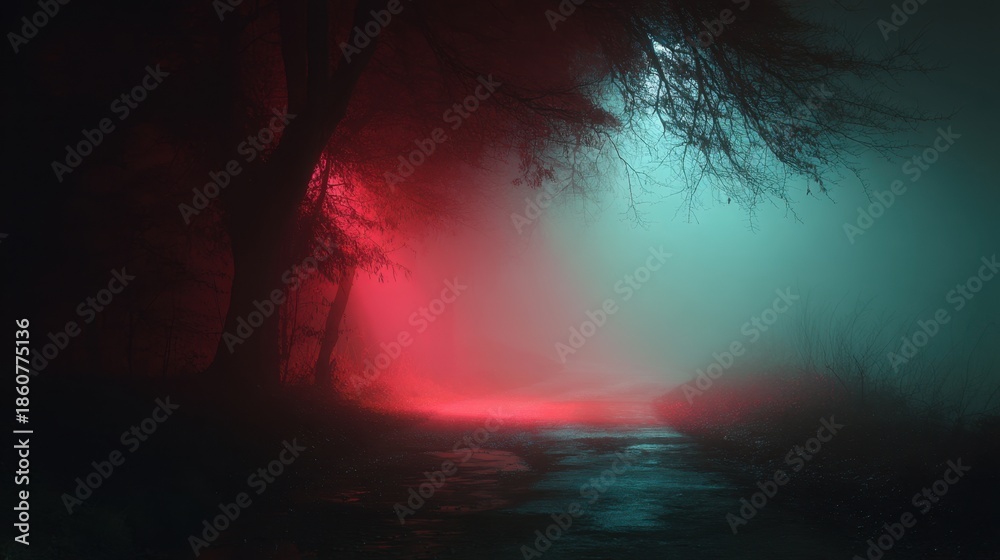 Las - A forest path is covered in fog during the night. Red and blue lights shine through the trees... #1860775136