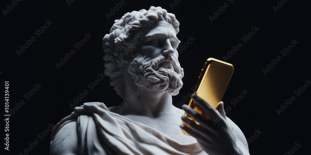 • A marble statue of a wise figure holds a modern smartphone in this stunning image. The contrast of old and new captures attention. A blend of classic art and technology. AI