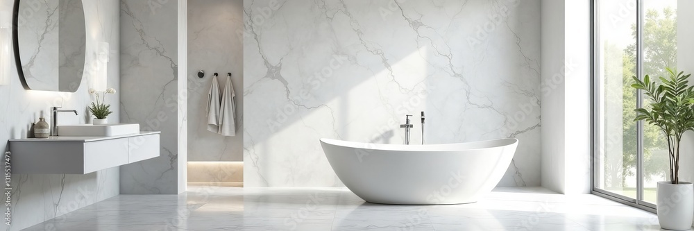 • Elegant white and gray marble bathroom with freestanding bathtub, elegant, luxury, bathtub