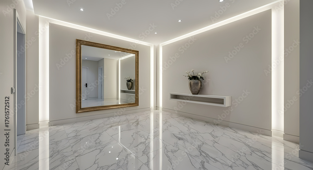 Marmur - Luxurious modern hallway with a large ornate mirror and marble flooring, illuminated by ambient... #1761572512