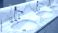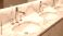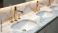 • Modern bathroom double sink vanity with white marble countertop and gold fixtures. Clean elegant design with ample counter space for everyday use. Luxurious home decor for upscale living.