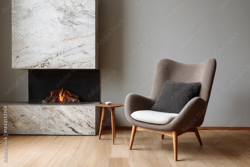 Marmur - A modern armchair sits beside a fireplace with a marble surround. #1842142954