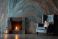 • Teal armchair by a fireplace with a marbled wall background.